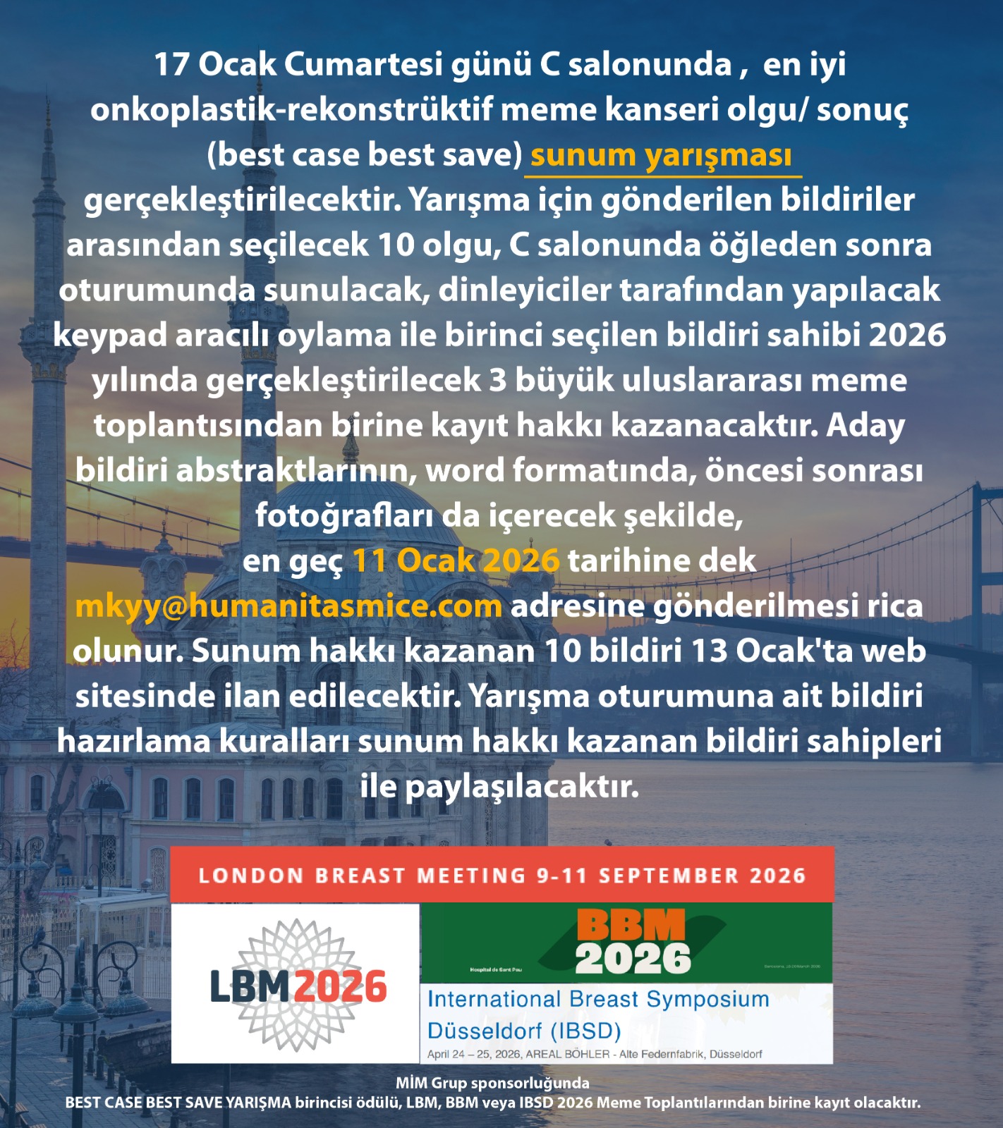 Meme kanserinin artık tek tip bir hastalık olmadığını biliyoruz. Böyle bir hastalıkta, kişiye özel yaklaşımların gerekliliği konusunda tartışmak, yapılmakta olanları ve yapılması gerekenleri değerlendirmek ve bilgilerimizi tazelemek için bu yıl 18. sini gerçekleştirmek üzere, 17-18 Ocak 2026 tarihleri arasında İstanbul’da düzenleyeceğimiz, Meme Kanserinde Yeni Yaklaşımlar Eğitim Toplantısı, İstanbul 2026’ya hepinizi davet etmekten onur duyarız.